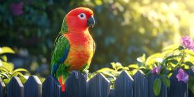 Sunlit Parrot on Garden Fence Vibrant Bird Photography