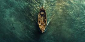 Aerial View Lone Vessel on Turbulent Ocean Waters