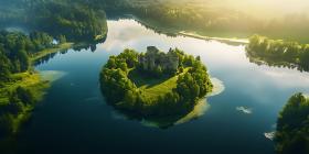 Aerial View Serene Island Castle Lush Green Foliage Calm Lake Na