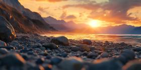 Stunning Sunset Over Rocky Beach A Scenic Coastal View