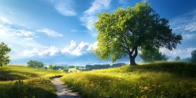 summer landscape tree field wildflowers path sunshine sky clouds nature scenery green yellow tranquil peaceful idyllic scenic countryside meadow grassland rural outdoor environment ecosystem flora vegetation foliage sunlit bright horizon view vista background texture beautiful serene calm peaceful scene natural beauty pathway winding path landscaping spring summer daytimeSimilar Photos