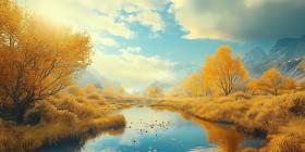 autumn river landscape golden trees leaves water reflection sky clouds nature scene tranquil idyllic peaceful serene calm yellow gold fall foliage trees branches sunlight sunset sunrise colors vibrant beautiful scenic view countryside environment seasonal october november september photography artwork art digital art painting illustrationSimilar Photos