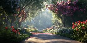 Sunlit Path Through Lush Garden Vibrant Flowers and Foliage