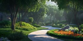 Serene Garden Path Lush Greenery Sunlight and Tranquil Landscape
