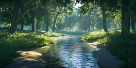Sunlit Stream in Lush Forest Tranquil Nature Scene