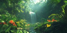 rainforest waterfall nature jungle tropical lush green leaves plants foliage sunlight light water cascade rocks moss flowers orange flowers yellow flowers vegetation environment ecosystem wildlife habitat natural beauty scenic landscape photography still image tropical rainforest hidden waterfall serene peaceful tranquil calm paradise escape getaway outdoor travel adventure exploration vibrant flora botanicalSimilar Photos