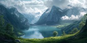 mountain lake mountain range landscape painting digital art serene landscape peaceful scenery nature painting clouds mountains lake hills trees scenic view tranquil scene digital painting artwork fantasy landscape mountain vista calm water reflection green hills blue lake sky artistic rendering natural beauty scenic vista panorama environment background illustration art digital artwork fantasy art mountainous region water reflection greenery picturesque idyllic awe-inspiring breathtaking majesticSimilar Photos