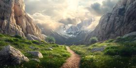 mountain path meadow alpine landscape nature rocks flowers wildflowers sunlight scenic view scenery photography travel adventure explore peaceful tranquil serene calm beauty hills valley clouds sky sun light green grass trail walking hiking outdoor environment ecosystem flora mountain range peak snow-capped digital art artwork illustrationSimilar Photos