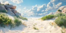 Stunning Beach Scene Sandy Path Lush Vegetation and Blue Sky