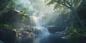 Misty Waterfall Lush Rainforest Scene Tranquil Nature Photograph