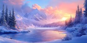 winter snow mountains sunset river landscape nature scenic peaceful serene tranquil cold icy trees evergreen fir pine sky clouds pastel colors reflection water mountain range winter wonderland christmas holiday season beautiful amazing gorgeous breathtaking view scene panorama art artwork illustration digital art paintingSimilar Photos
