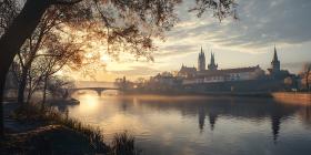 sunrise cityscape river water buildings architecture golden hour sun landscape scenic nature reflection tranquil peaceful calm serene morning dawn mist fog tree branches sky clouds town city urban panorama view vista beautiful stunning breathtaking idyllic picturesque evocative atmosphere historical cultural riverside light golden silhouetteSimilar Photos