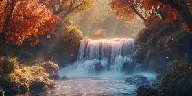 waterfall forest autumn leaves trees nature scenic landscape water river rocks light sunlight golden magical mystical enchanted peaceful serene tranquil beautiful wonder dreamlike fantasy artistic illustration artwork digital art painting photography background texture scene view environment ambiance mood fall colors orange yellow blue greenSimilar Photos