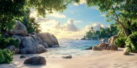 tropical beach sunset ocean waves sand rocks foliage palm trees paradise digital art illustration peaceful serene calm tranquil relaxing escape tropical vacation holiday summer beach scene nature landscape seascape background wallpaper desktop wallpaper idyllic scenic beautiful vibrant sun sky clouds tropical island coastline artwork digital painting artistic sea shoreSimilar Photos