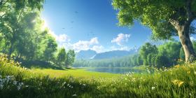 landscape nature summer sunlight trees meadow hills green peaceful serene calm idyllic vibrant blue sky sun grass foliage field countryside rural environment scenery vista view beautiful amazing breathtaking tranquil scenic outdoor photography art digital art illustration background wallpaper desktop screen relaxing peaceful harmony springSimilar Photos