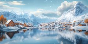 winter village snow mountains lake reflection houses wooden snowy landscape peaceful serene magical winter wonderland christmas holiday season cold beautiful scenic nature art digital art illustration painting artwork fantasy whimsical idyllic cozy cabin home snowflakes sky clouds trees frozen calm quiet charming picturesque ambianceSimilar Photos