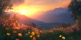 Sunset Meadow Vibrant Floral Landscape Mountain Scenery