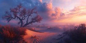 sunset landscape desert scene lone tree sand dunes pink sky orange sky purple sky vibrant colors serene peaceful mystical tranquil beautiful nature photography scenic view panoramic view ethereal hazy atmospheric dramatic sky golden hour landscape photography digital art artistic fantasy landscape dreamlike majestic solitary tree desert landscape photography sunset colors cloud formations horizon natural beauty scenic vista evocative mood atmosphere light texture depth color compositionSimilar Photos