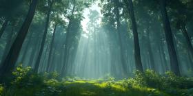 Mystical Forest Sunbeams Through Lush Green Canopy Nature Photo