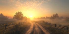 sunrise rural landscape misty path golden hour photography countryside scene nature background tree trees fence field morning dawn sun light peaceful serene tranquil calm beautiful vibrant golden yellow orange fog atmosphere rural scene country road farmland nature photography outdoor scenic panorama horizon sky sunshine golden light country lifeSimilar Photos