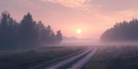 sunrise sunset landscape nature photography mist fog trees field road path countryside rural dawn morning scenic peaceful tranquil serene calm atmospheric haze light golden hour soft light colors pink purple blue horizon sky clouds silhouette dirt road country lane open space natural environment outdoor beauty vibrant scenic view sunSimilar Photos