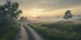 sunrise landscape rural countryside road path mist fog trees morning dawn peaceful serene nature scenic photography calm tranquil quiet field grass green golden hour sun sky light beautiful scenic view natural beauty outdoor environment vista country lane farmland idyllic atmosphere ambiance summer spring autumn winding road perspective horizonSimilar Photos