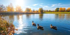 Autumn Pond Scene Ducks Trees and Golden Leaves Nature Photogra