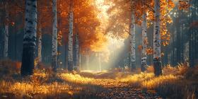 Autumn Birch Forest Sunlit Path Golden Leaves Nature Scene