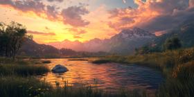 sunset landscape nature mountains river meadow golden hour serene peaceful calm tranquil scenic beautiful view panorama twilight evening sky clouds reflection water grass hills field fireflies lights magical atmosphere wonder peace beauty outdoors environment scenery vista rural countryside golden sun horizon art digital art paintingSimilar Photos