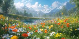 meadow wildflowers mountains river spring nature landscape scenic beautiful vibrant colors flowers flora alpine mountain range idyllic peaceful serene calm tranquil summer sunshine sky clouds green trees foliage water panorama view scenery outdoor environment natural beauty photography background artwork scene illustration artisticSimilar Photos