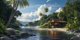 tropical paradise cabin river riverfront lush palm trees landscape nature scenic peaceful escape secluded vacation getaway tropical paradise river scene tropical landscape wooden cabin palm tree green foliage clear sky clouds sunlight water rocks beach shore relaxing serene tranquil calm tropical house jungle forest tropical plants tropical getaway tropical vacation dream vacation tropical escape holiday travel paradise island tropical retreatSimilar Photos