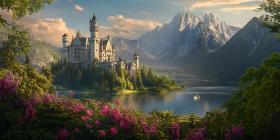 castle lake mountains valley fantasy landscape digital painting art scenic beautiful peaceful magical serene flowers pink flowers green lush towering hills nature trees sky clouds sun light warm light water reflection idyllic whimsical dreamlike illustration artwork painting digital art fantasy art concept art environment art scenic view vista picturesque kingdom royal majesticSimilar Photos