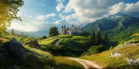 chateau castle mountain landscape scenic nature photography hills trees wildflowers path dirt road sky clouds sun sunlight green lush vegetation alpine rural countryside vista view travel adventure outdoor scenic view beautiful picturesque serene peaceful tranquil calm summer daytime horizon panorama mountain range idyllic resort building architecture estateSimilar Photos