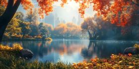 autumn fall lake leaves trees nature landscape scenic reflection water sunlight colors vibrant foliage peaceful serene calm tranquil autumnal season photography picturesque beautiful forest woods golden hour orange red yellow green blue sky artistic scene artwork digital art illustration environment natural viewSimilar Photos