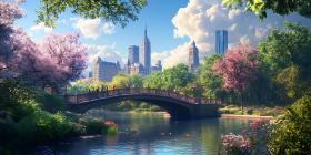 city park spring blossoms cherry blossoms urban landscape skyline bridge waterway trees flowers nature city park scenic beautiful peaceful tranquil idyllic serene vibrant colorful spring summer artwork digital art illustration fantasy dreamlike artistic painting landscape urban metropolis architecture buildings clouds sky sun light green pink blueSimilar Photos