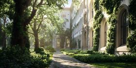 Sunlit Alleyway Lush Greenery and Classic Architecture