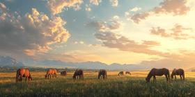 Epic Sunset Landscape Horses Grazing in a Serene Meadow