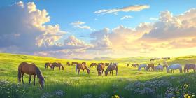 horses meadow sunset landscape rural countryside equine nature scenic pastoral field grassland animals farm wildlife sky clouds sun golden hour beautiful peaceful tranquil serene vibrant wildflowers flora fauna photography art digital art image picture illustration painting background wallpaper spring summer horizon open spaceSimilar Photos