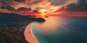 sunset beach tropical ocean sea aerial view coast landscape nature sky clouds horizon islands water sand vegetation palm trees travel vacation paradise exotic beautiful scenic vista view photography color vibrant calm serene peaceful idyllic tropical beach aerial photography sunset view coastal landscape island landscape holiday escape getawaySimilar Photos