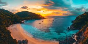 sunset beach aerial view tropical paradise ocean water sand cove cliff coastline nature landscape vacation travel holiday serenity peaceful beautiful scenic panorama exotic island golden hour azure turquoise vibrant color sky clouds relaxation escape seascape drone photography summer tropical beach hidden beach secluded cove coastal viewSimilar Photos