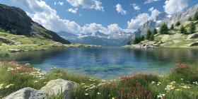 alpine lake mountain scenery natural beauty serene landscape vibrant wildflowers crystal clear water mountain range summer landscape scenic view peaceful environment outdoor adventure travel destination alpine meadow mountain lake blue water rocky shore clouds sky landscape photography nature photography beautiful scenery tranquil scene mountain peaks hiking destination wildlife habitat flora fauna eco tourism getaway vacation spot idyllic scene amazing view breathtaking landscape summer adventure mountain vista alpine flowers spectacular view scenic panorama untouched natureSimilar Photos