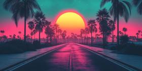 sunset palm trees road highway tropical retro vintage neon pink teal orange vibrant colors art digital art illustration background wallpaper aesthetic graphic design scene landscape night evening sky sun palm trees path journey travel summer heat warm bright vivid colorful artistic creative artworkSimilar Photos