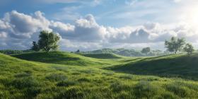 Serene Rolling Hills Landscape Lush Green Meadow under a Sunny S