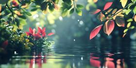 garden pond reflection water flowers red flowers green leaves foliage lush nature tranquil serene peaceful calm sunlight natural environment landscape scenic vibrant colors botanical flora plants vegetation beautiful pretty scenic view outdoor still water mirror reflection in water spring summer autumn scenic background nature scene artistic painting illustration digital artSimilar Photos