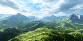 Majestic Mountain Range Panorama Lush Green Peaks and Blue Skies