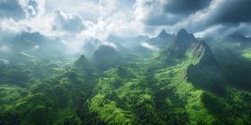 mountain landscape aerial view forest green lush trees peaks rocks clouds sky sunlight nature scenic view wilderness dramatic beautiful serene peaceful untouched hills vegetation remote environment outdoor panorama vista scenery background texture green hills mountain range cloud cover sunbeams natural beauty travel adventure exploration ecosystem flora geology terrainSimilar Photos
