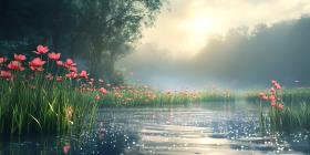 misty river meadow pink flowers sunrise tranquil scene peaceful dreamy nature serene calm water plants flora landscape scenic beautiful morning light colors soft subtle environment outdoor background texture scenic view idyllic pastoral field wildflowers sun fog haze riverbank vegetation reflection still water countryside rural woods forest trees blossom bloomSimilar Photos