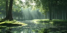 forest trees sunlight sunbeams nature peaceful tranquil calm serene green foliage leaves woodland woods path stream water marsh landscape scenic background wallpaper backdrop environment scene view vista outdoors natural illustration digital art artwork art design graphics photography photo image picture summer spring morning light shadowSimilar Photos