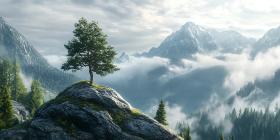 Majestic Mountain Peak Lone Tree in a Sea of Clouds