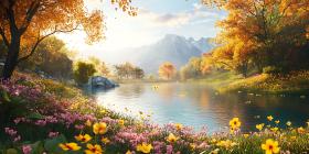autumn landscape river trees golden leaves flowers bloom nature scenic fall season beautiful peaceful serene tranquil sunlight mountains reflection water colorful vibrant yellow flowers pink flowers artistic painting illustration digital art fantasy magical dreamlike enchanted autumn colors foliage flora environment scenery view panorama background wallpaper artwork pretty amazingSimilar Photos